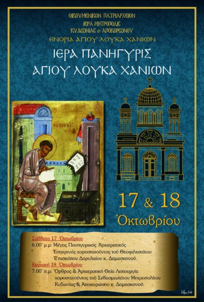 Στις 17-18 Οκτωβρίου, λαμβάνει χώρα η Ιεράς Πανήγυρις του Αγίου Λουκά Χανίων. Το Σάββατο 17 Οκτωβρίου θα εκκινήσει Μέγας Αρχιερατικός Εσπερινός χοροστατούντος του Θεοφιλεστάτου Επισκόπου Δορυλαίου κ. Δαμασκηνού. Την Κυριακή θα προεξάρχει της Θείας Λειτουργίας ο Σεβασμιώτατος Μητροπολίτης Κυδωνίας και Αποκορώνου κ. Δαμασκηνός.