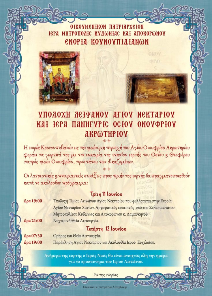 Η Ενορία Κουνουπιδιανών στην ομώνυμη περιοχή του Αγίου Ονουφρίου Ακρωτηρίου φοράει τα γιορτινά της με την ευκαιρία της ετησίου εορτής του Οσίου και Θεοφόρου πατρός Ονουφρίου, Προστάτου των δικαζομένων.