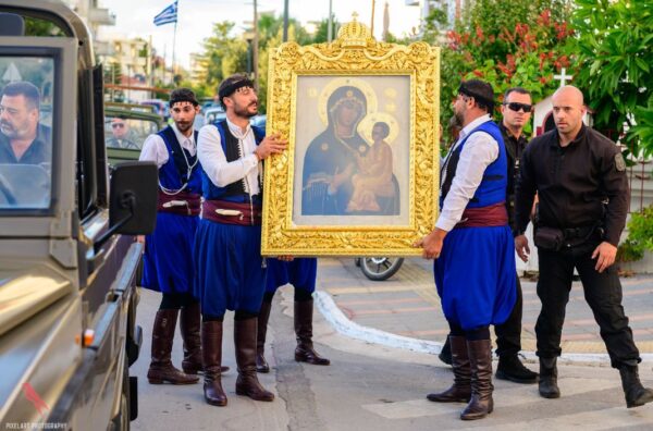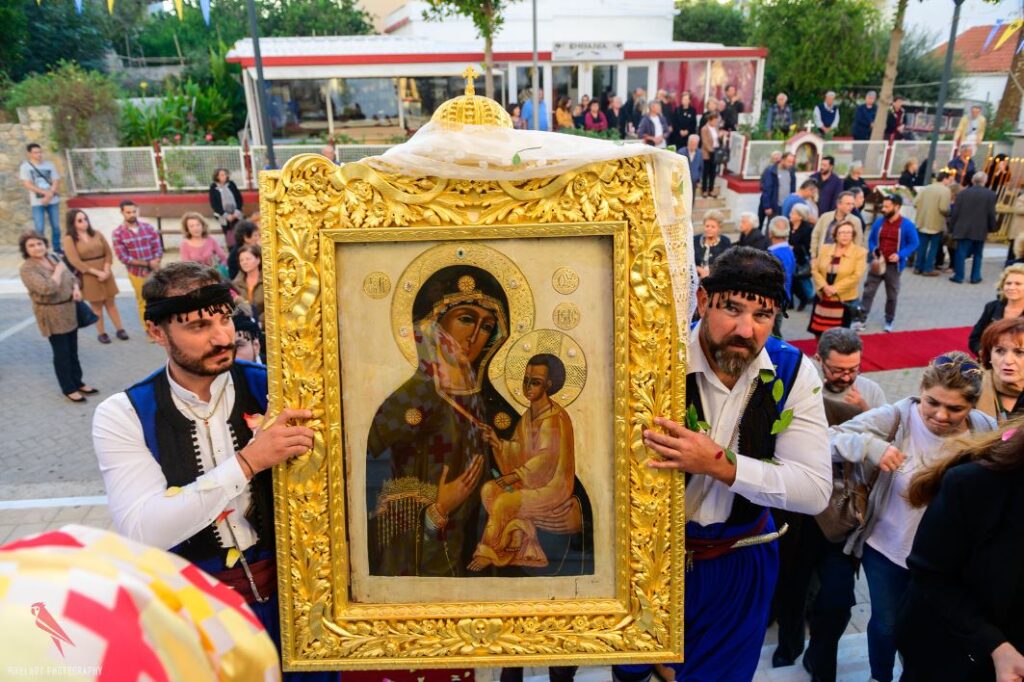 Η Ιερά Εικόνα της Παναγίας μεταφέρθηκε με πομπή και με τη συνοδεία της Αστυνομίας πάνω σε οχήματα της ομάδος διατήρησης ιστορικών οχημάτων του Παραρτήματος Χανίων και τον χορευτικό παραδοσιακό σύλλογο ο Ζάλος.