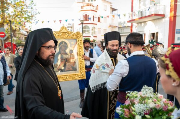 Με παιανισμούς της μπάντας του Δήμου υποδέχτηκε την Ιερά Εικόνα στα προπύλαια του Ναού ο Πανοσιολογιώτατος Πρωτοσύγκελλος μας Αρχιμ. Δαμασκηνός Λιονάκης, εκπροσωπώντας τον Σεβασμιώτατο Ποιμενάρχη μας που βρίσκεται στο Βέλγιο, στη Συνοδεία του Οικουμενικού μας Πατριάρχου κ.κ. Βαρθολομαίου, μαζί με τον Γενικό μας Αρχιερατικό Επίτροπο Πρωτ. Γεώργιο Περάκη και τον Ιερατικό Προϊστάμενο του Ναού Πανοσιολογιώτατο Αρχιμ. του Οικουμενικού Θρόνου Αμφιλόχιο Παπαγιαννάκη.