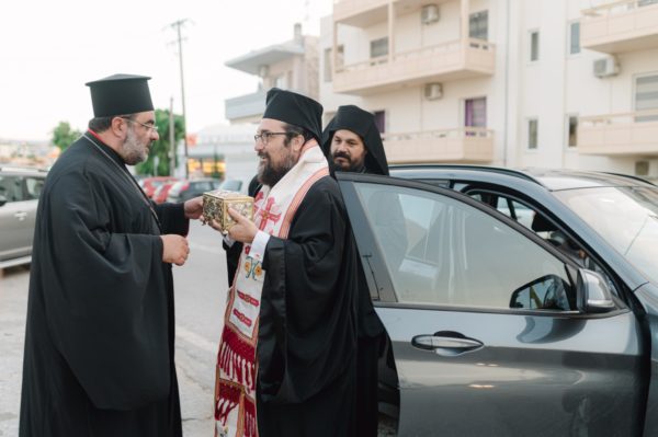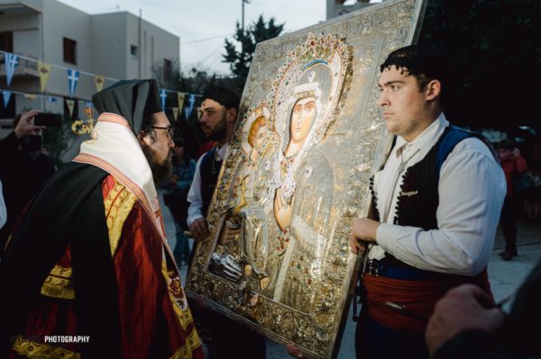 Λίγες ώρες πριν τα εγκαίνια του Ιερού Ναού του Αγίου Δημητρίου στα Κουνουπιδιανά Ακρωτηρίου Κρήτης, σε πανηγυρικό κλίμα, κλήρος και λαός υποδέχθηκαν πριν τον Αρχιερατικό εσπερινό της εορτής του Αγίου χθες (25/10/2020) την Παναγία την Τριχερούσα. Την εικόνα που κόμισε η αδελφότητα της Ιεράς Μονής Αγίας Τριάδος των Τζαγκαρόλων, με τη συνοδεία αντρών και γυναικών με παραδοσιακές κρητικές στολές, υποδέχτηκε στα προπύλαια του Ναού ο Θεοφιλέστατος Επίσκοπος Δορυλαίου, Πρωτοσυγκελλεύων της Μητροπόλεως Κυδωνίας και Αποκορώνου και Καθηγούμενος της Μονής, κ. Δαμασκηνός, ο οποίος νωρίτερα είχε εναποθέσει τα Ιερά Μαρτυρικά Λείψανα Αγίων στην Αγία Τράπεζα του Ναού για τη σημερινή τελετή εγκαινίων, που πραγματοποιήθηκε από τον ίδιο.