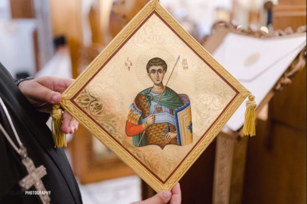 Παράλληλα προσέφερε στο Θεοφιλέστατο που πρώτη φορά επισκέφθηκε τον Ιερό Ναό του Αγίου Δημητρίου ως Επίσκοπος ένα επιγονάτιο με την μορφή του Αγίου Δημητρίου.