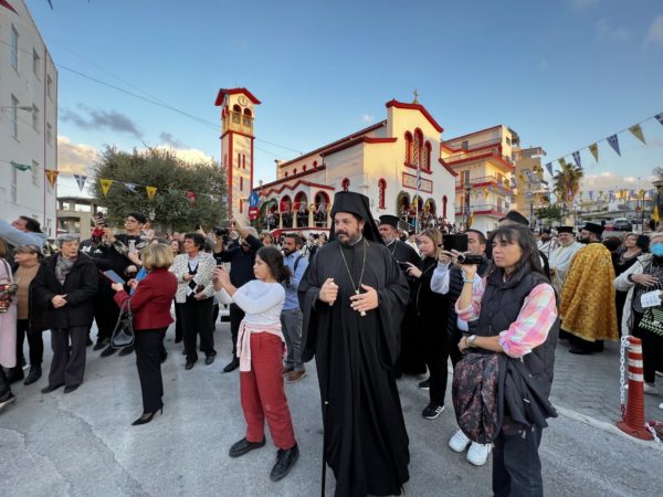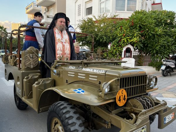 Η ιερά Εικόνα μετεφέρθηκε πάνω σε στρατιωτικό ιστορικό όχημα βασταζόμενη από άντρες με παραδοσιακές στολές της Κρήτης και των Δωδεκανήσων και με την συνοδεία της αστυνομίας κατέφθασε στα προπύλαια του Πανηγυρίζοντος Ιερού Ναού Αγίου Νεκταρίου Χανίων.