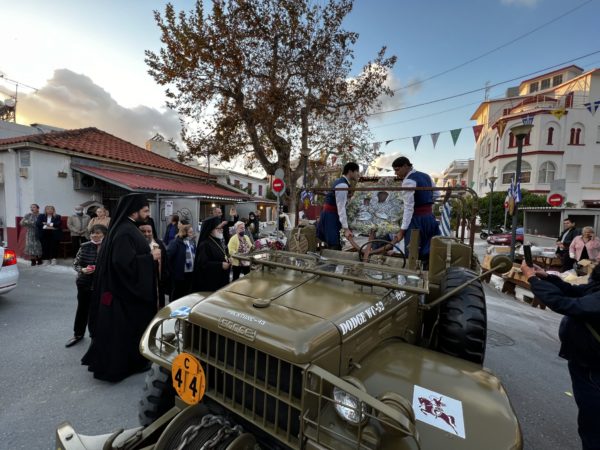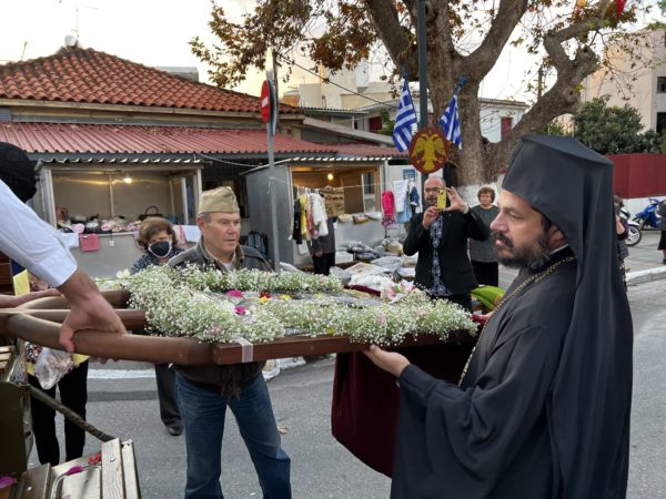 Η ιερά Εικόνα μετεφέρθηκε πάνω σε στρατιωτικό ιστορικό όχημα βασταζόμενη από άντρες με παραδοσιακές στολές της Κρήτης και των Δωδεκανήσων και με την συνοδεία της αστυνομίας κατέφθασε στα προπύλαια του Πανηγυρίζοντος Ιερού Ναού Αγίου Νεκταρίου Χανίων.