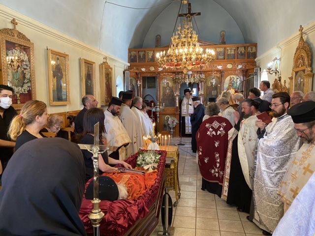 Την Εξόδιο τέλεσε ο Σεβασμιώτατος Ποιμενάρχης κ. Δαμακηνός συμπαραστατούμενος από τον Πρωτοσυγκελλεύοντα Θεοφιλέστατο Επίσκοπο Δορυλαίου κ. Δαμασκηνό, πλειάδα ιερέων και Μοναστικών Αδελφοτήτων.