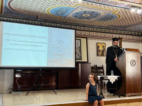 Ακολούθησε επετειακή εκδήλωση στο ενοριακό κέντρο στην οποία ομίλησαν ο κ. Δημήτριος Νικολακάκης, ιστορικός – ερευνητής και ο πολιτικός μηχανικός κ. Αντώνιος Μαρματάκης.