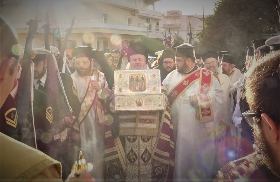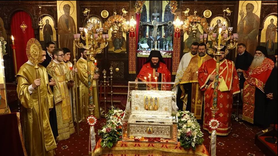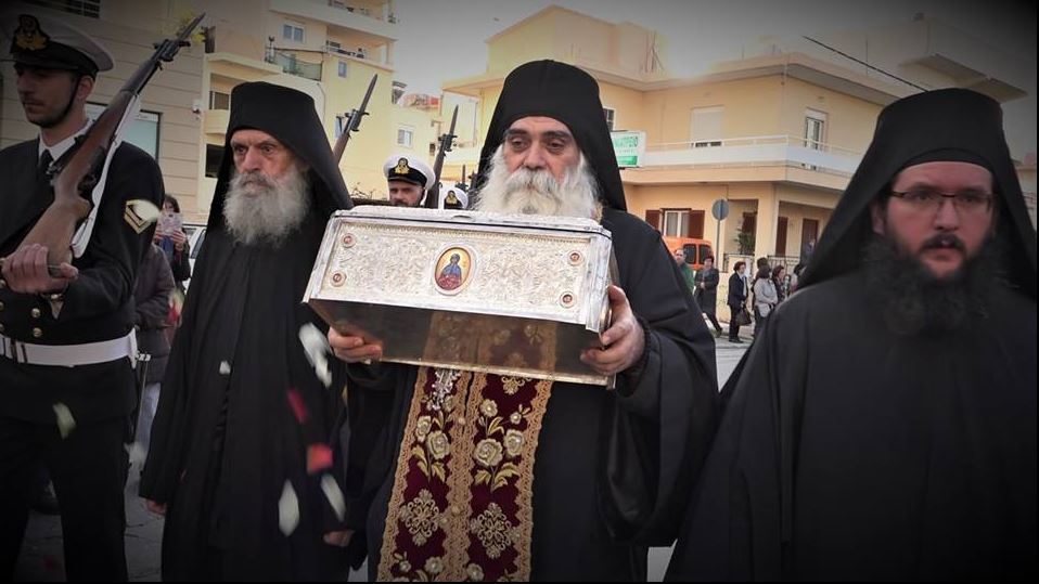 Ὑποδοχὴ, ὑπὸ τοῦ Σεβασμιωτάτου Μητροπολίτου μας κ.κ. Δαμασκηνοῦ καὶ τῶν ἀρχῶν τῆς πόλεως ἐπὶ τῶν ὁδῶν Παπαναστασίου καὶΡουκουτάκη, τῶν ἱερῶν λειψάνων τῶν Τριῶν Ἱεραρχῶν, Βασιλείου τοῦ Μεγάλου, Γρηγορίου τοῦ Θεολόγου καὶ Ἰωάννου τοῦ Χρυσοστόμου ἐκ τῆς Ἱερᾶς Μονῆς Ἁγίου Παύλου Ἁγίου Ὄρους, τὰ ὁποῖα θὰ παραμείνουν εἰς τὸν Ἱερὸν Ναόν τοῦ Ἁγίου Χαραλάμπους ἕως τὸἑσπέρας τῆς Κυριακῆς 3 Φεβρουαρίου.