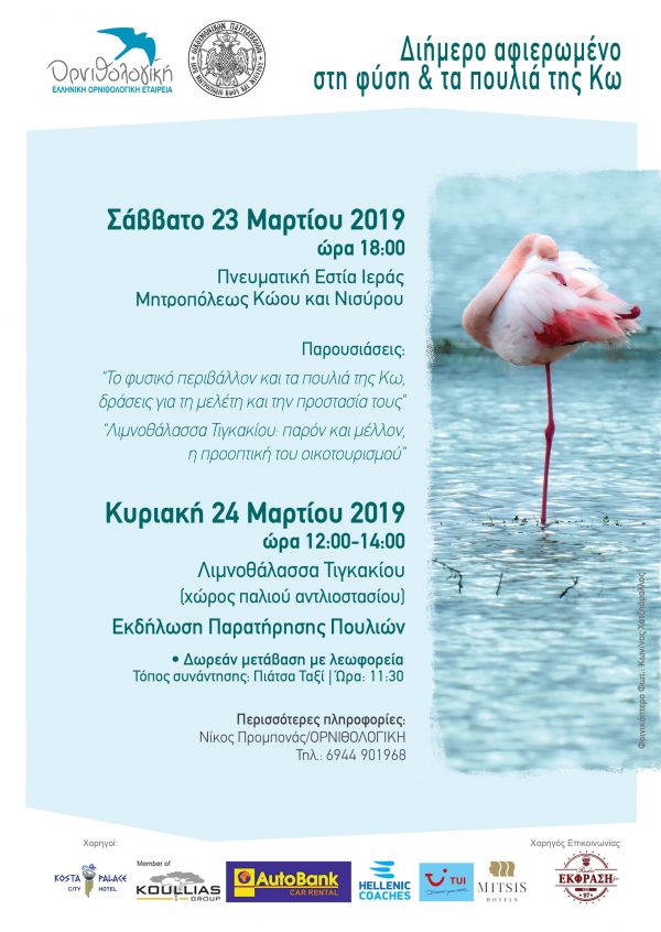 Ἡ Ἑλληνική Ὀρνιθολογική Ἑταιρεία καί ἡ Ἱερά Μητρόπολις Κώου καί Νισύρου διοργανώνουν διήμερο ἀφιερωμένο στή φύση καί στά πουλιά τῆς Κῶ.