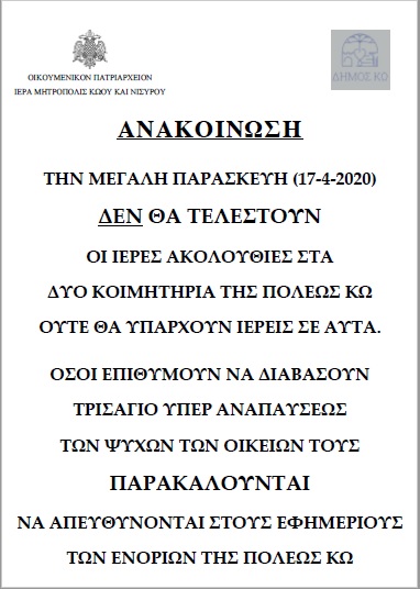 Η Ιερά Μητρόπολη Κώου και Νισύρου σε συνεργασία με το Δήμο Κώου ανακοινώνει ότι δε θα τελεστούν οι Ιερές Ακολουθίες στα Κοιμητήρια της Πόλεως την Μεγάλη Παρασκευή και δε θα υπάρχουν ιερείς σε αυτά.