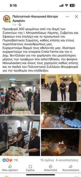 Ο λόγος για την προσφορά 300 γευμάτων από τη δομή Συσσιτίων της Ι. Μητροπόλεως Λάμπης, Συβρίτου και Σφακίων στα στελέχη και το προσωπικό του Πυροσβεστικού Σώματος καθώς και στους πυρόπληκτους ανθρώπους στην περιοχή.