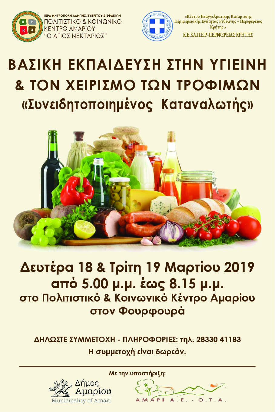 Το Πολιτιστικό & Κοινωνικό Κέντρο Αμαρίου “Ο Άγιος Νεκτάριος”, της Ι. Μητρόπολης Λάμπης, Συβρίτου και Σφακίων, σε συνεργασία με το Κέντρο Επαγγελματικής Κατάρτισης της Περιφερειακής Ενότητας Ρεθύμνου(ΚΕΚΑΠΕΡ – Περιφέρειας Κρήτης), συνδιοργανώνουν διήμερη εκπαίδευση με θέμα: “Βασική εκπαίδευση στην υγιεινή και τον χειρισμό τροφίμων. Συνειδητοποιημένος Καταναλωτής”.