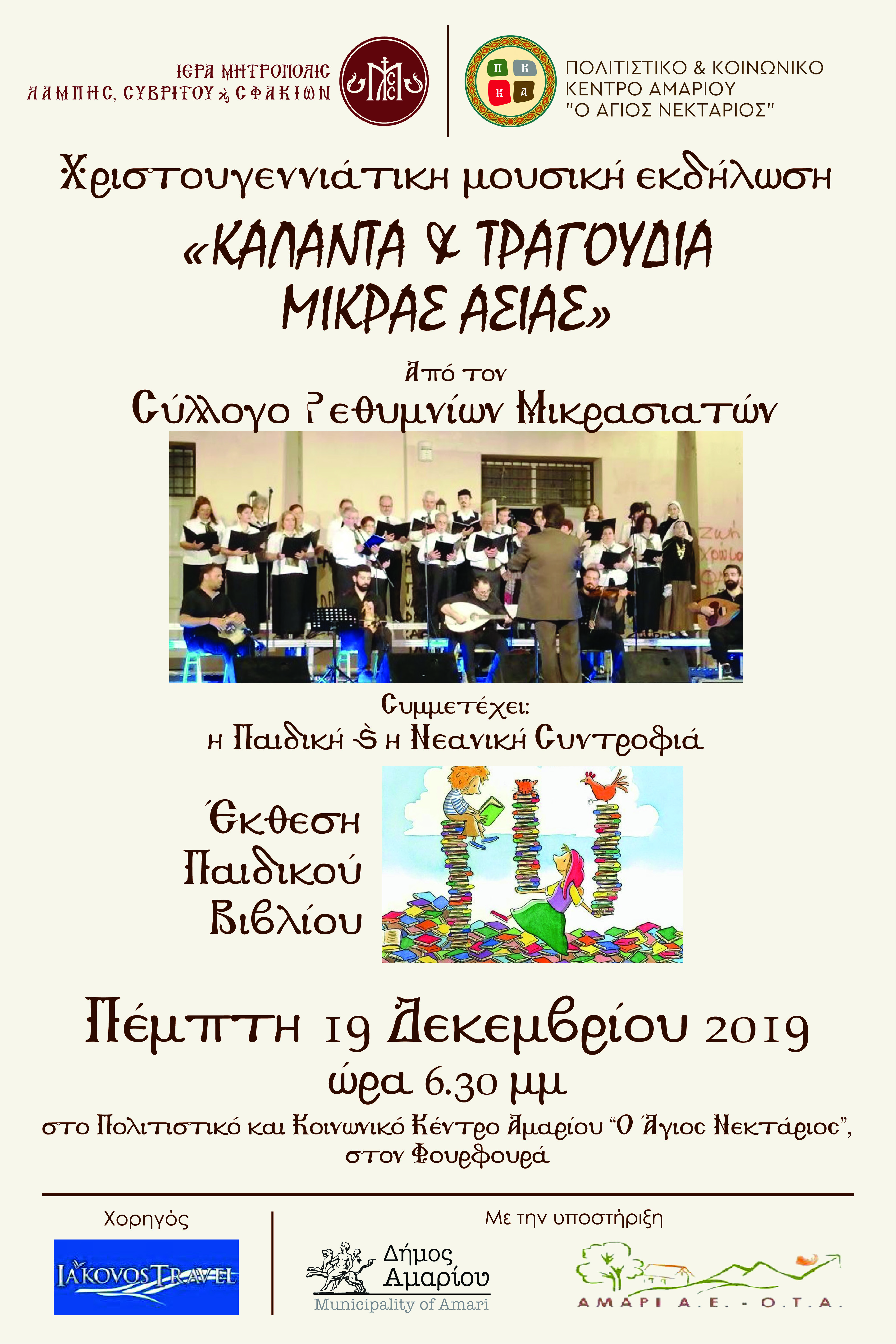 Κάλαντα και τραγούδια της Μικράς Ασίας θα τραγουδήσουν τα μέλη της χορωδίας του Συλλόγου Ρεθυμνίων Μικρασιατών, υπο την διεύθυνση του κ. Ανδρέα Γιακουμάκη, Άρχοντος Μαϊστορος της Αγίας του Χριστού Μεγάλης Εκκλησίας.