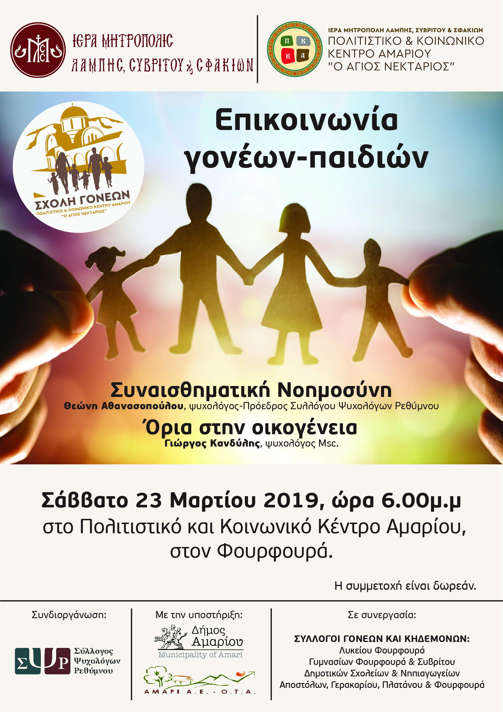 Η Σχολή Γονέων του Πολιτιστικού & Κοινωνικού Κέντρου Αμαρίου «Ο Άγιος Νεκτάριος», της Ι. Μητρόπολης Λάμπης, Συβρίτου και Σφακίων, σε συνεργασία με τον Σύλλογο Ψυχολόγων Ρεθύμνου, διοργανώνει την 3η συνάντηση Γονέων με θέμα: “Επικοινωνία γονέων-παιδιών”.