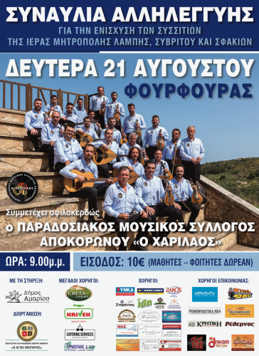 Συναυλία αλληλεγγύης για την ενίσχυση των συσσιτίων της Ιεράς Μητρόπόλεως Λάμπης Συβρίτου και Σφακίων θα πραγματοποιηθεί την Δευτέρα 21 Αυγούστου στον Φουρφουρά Αμαρίου.