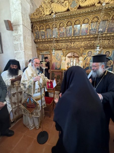 Επίσης ο Μητροπολίτης Κισάμου και Σελίνου προσέφερε στην Καθηγουμένη της Μονής, Χρυσοστόμη Μοναχή, αντίγραφο Σταυρού ευλογίας, εκ του Κειμηλιαρχείου της Ιεράς Πατριαρχικής Μονής Γωνιάς.