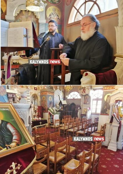 Στο αναλόγιο ο ιεροψάλτης Μανώλης Καζαβούλης και φυσικά τα στασίδια ήταν άδεια από πιστούς, μετά τα αυστηρά μέτρα που έχουν ληφθεί.
