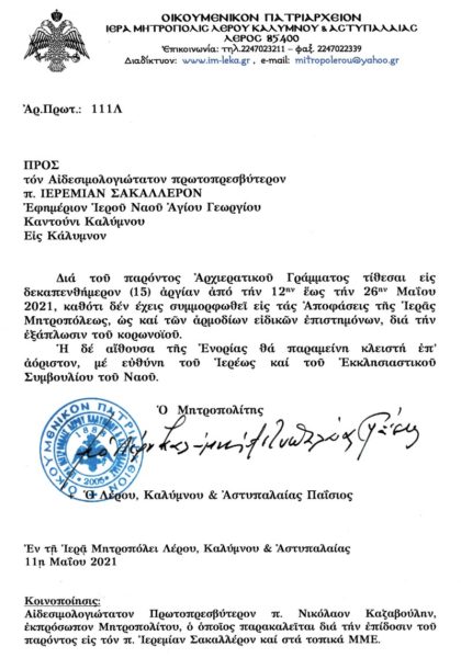 Σε δεκαπενθήμερη αργία έθεσε ο Μητροπολίτης Λέρου κ. Παϊσιος σε ιερέα που δεν εφάρμοσε τις Αποφάσεις της Ιεράς Μητροπόλεως και των ειδικών επιστημόνων για την εξάπλωση του κορωνοϊού.