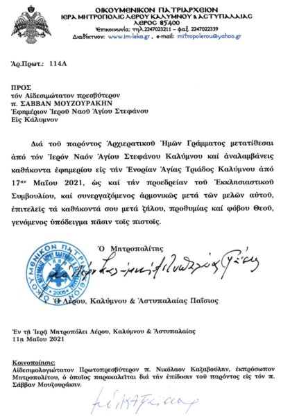 Συγκεκριμένα, ο Σεβασμιώτατος Μητροπολίτης Λέρου, Καλύμνου και Αστυπαλαίας κ. Παΐσιος, προέβη στις κάτωθι αποφάσεις οι οποίες αφορούν: