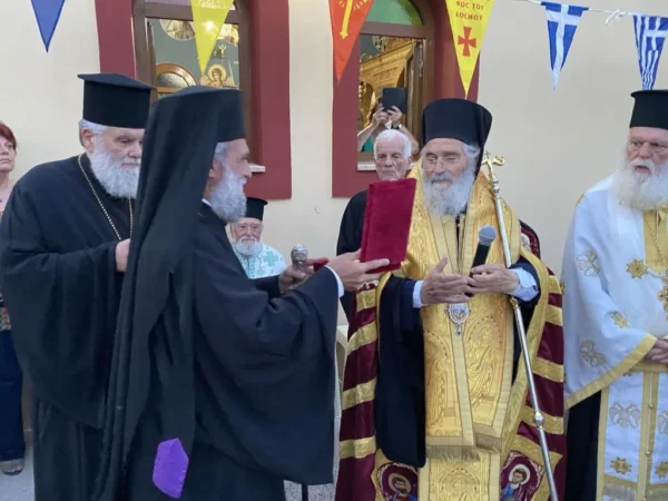 Μετά το πέρας του Εσπερινού, ο Θεοφιλέστατος Επίσκοπος Στρατονικείας κ. Στέφανος, εκ μέρους του Ιερού Κλήρου, με την ευκαιρία των ονομαστηρίων του Μητροπολίτου αλλά και των 20 ετών Αρχιερατείας, ενεχείρισε στον Μητροπολίτη ένα εγκόλπιο. Ο Θεοφιλέστατος απηύθυνε εόρτιες ευχές στον Μητροπολίτη μας, ευχαριστώντας τον παράλληλα για την μεγάλη αγάπη που απλόχερα περιβάλει τον ιερό κλήρο και το ποίμνιο της Επαρχίας.
