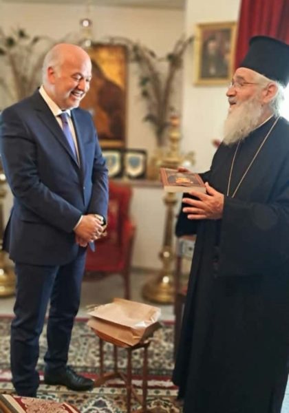 Ο Σεβαμσιώτατος καλωσόρισε τον κ. Υπουργό, αντάλλαξαν απόψεις και τέλος ο Σεβασμιώτατος του προσέφερε το βιβλίο του Αγίου Σάββα.