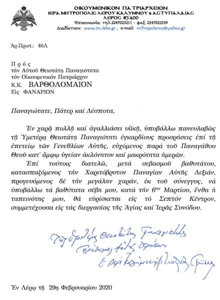 Το Σάββατο 29 Φεβρουαρίου 2020, ο Παναγιώτατος Οικουμενικός Πατριάρχης κ. κ. Βαρθολομαίος, εόρτασε την 80ήν επέτειον των Σεπτών Γενεθλίων Του. Ο Σεβ. Μητροπολίτης Λέρου, Καλύμνου και Αστυπάλαιας, κ. Παΐσιος, ευχήθηκε με πολλές εγκάρδιες ευχές.
