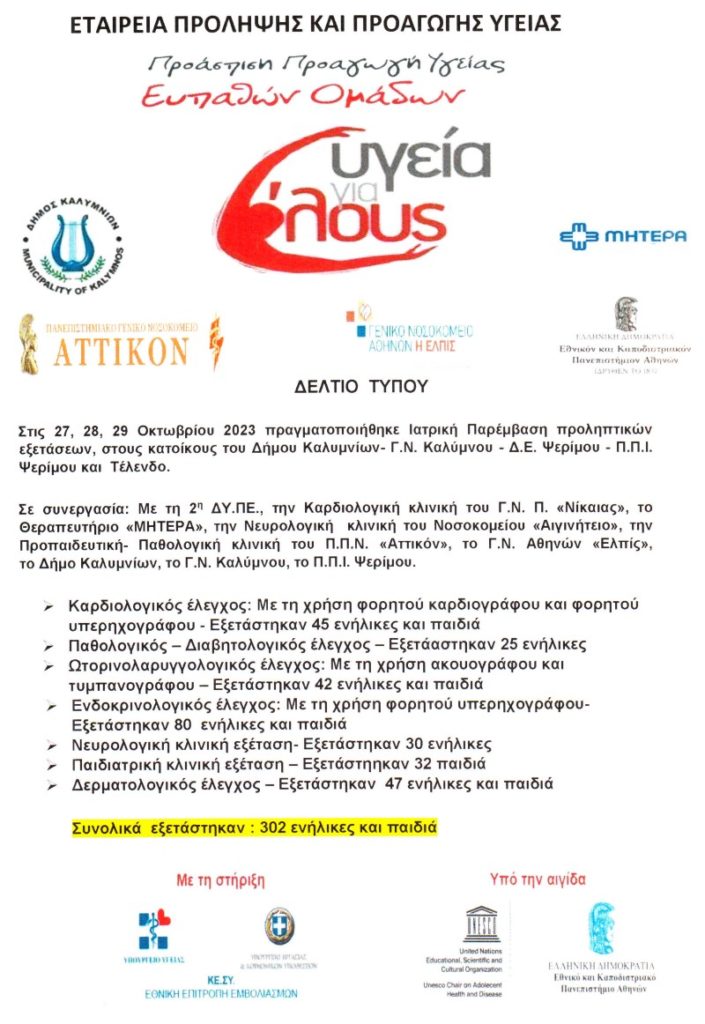 Σε συνεργασία με τη 2η ΔΥ.ΠΕ, την Καρδιολογική κλινική του Γ.Ν.Π. «Νίκαιας», το Θεραπευτήριο «ΜΗΤΕΡΑ», την Νευρολογική κλινική του Νοσοκομείου «Αιγινήτειο», την Προπαιδευτική – Παθολογική κλινική του Π.Π.Ν. «Αττικόν», το Γ.Ν. Αθηνών «Ελπίς», το Δήμο Καλυμνίων, το Γ.Ν. Καλύμνου, το Π.Π.Ι. Ψερίμου.
