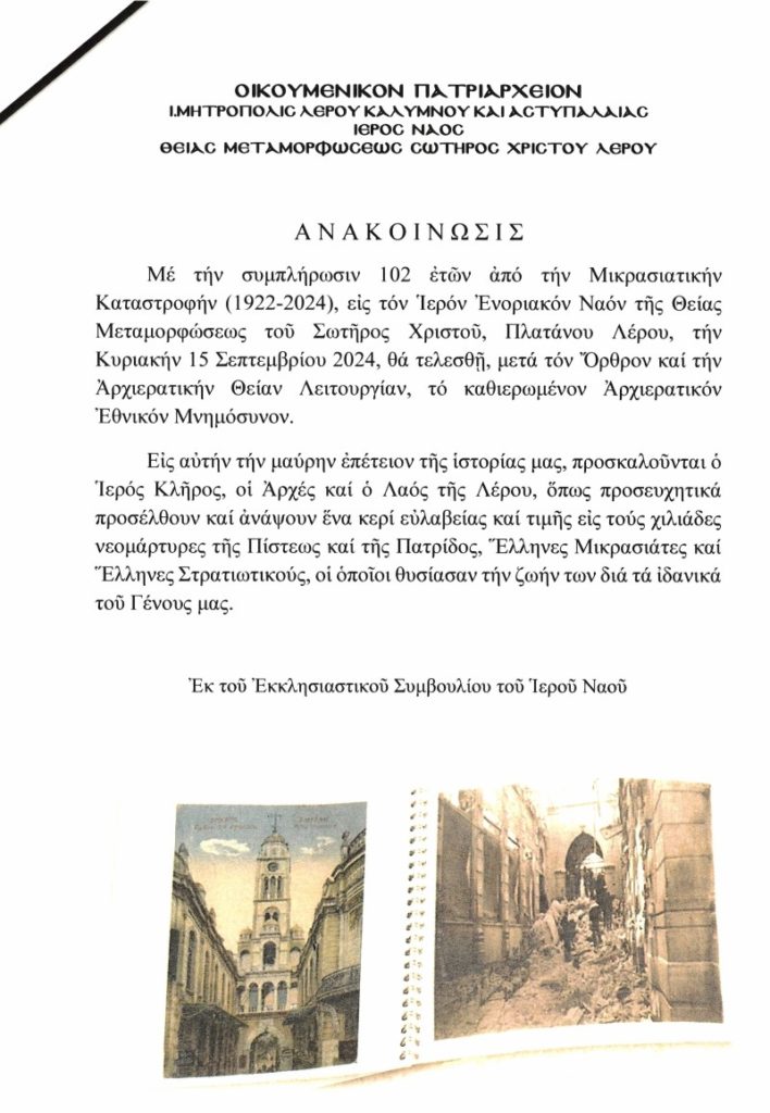 Με τη συμπλήρωση 102 ετών από την Μικρασιατική Καταστροφή, στον Ιερό Ναό της Θείας Μεταμορφώσεως του Σωτήρος Χριστού, Πλατάνου Λέρου, την Κυριακή 15 Σεπτεμβρίου, θα τελεσθεί μετά τον Όρθρο και την Αρχιερατική Θεία Λειτουργία, το καθιερωμένο Αρχιερατικό Εθνικό Μνημόσυνο.