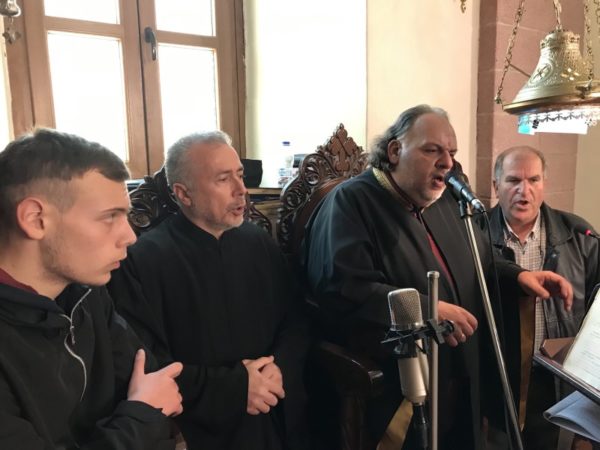 Στο ιερό αναλόγιο έψαλλαν οι καλλίφωνοι ιεροψάλτες, υπό την διεύθυνση του μουσικολογιωτάτου Πρωτοψάλτου Ελευθερίου Χατζηλάρη, Αναστάσιος Χατζηλάρης, Ιωάννης Γκιουζέππος, Ιωάννης Χατζηλάρης και Άγγελος Αγγελίδης.