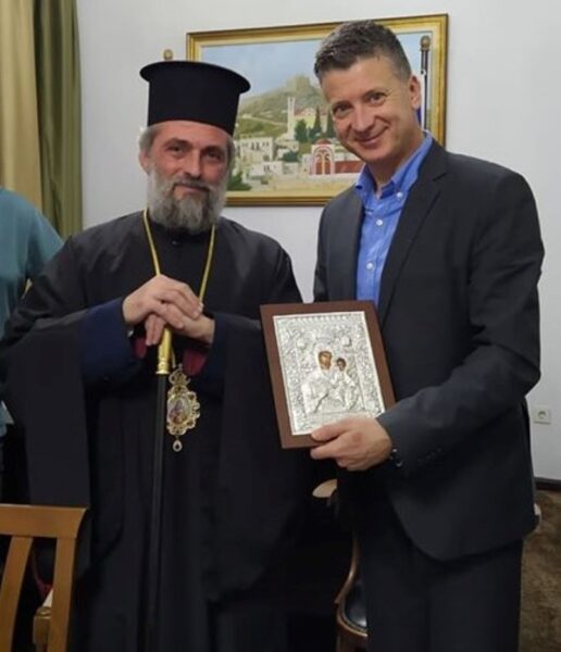 Στην Λέρο τον Σεβασμιώτατο εκπροσώπησε ο Θεοφιλέστατος Επίσκοπος Στρατονικείας κ. Στέφανος, ο οποίος του ενεχείρισε την Εικόνα της Παναγίας του Κάστρου.