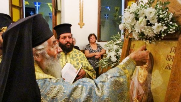 Πριν το τέλος της Θείας Λειτουργίας ο Μητροπολίτης έχρισε δια Αγίου Μύρου την Εικόνα της Οσίας Γαβριηλίας, και για μία ακόμη φορά ευχαρίστησε τον Παναγιώτατο και την Ιερά Σύνοδο για την ιστορική για τη Μητρόπολη Αγιοκατάταξη της Οσίας.