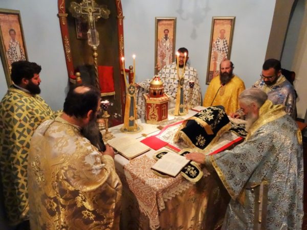 Μετά την επίσημη υποδοχή της Τιμίας Κάρας, στον παρακείμενο ιερό ναό της Υψώσεως του Τιμίου Σταυρού τελέσθηκε πανηγυρικός αρχιερατικός εσπερινός μετ’ αρτοκλασίας και στη συνέχεια όρθρος και νυκτερινή Θεία Λειτουργία, προεξάρχοντος του Σεβασμιωτάτου κ. Παϊσίου.