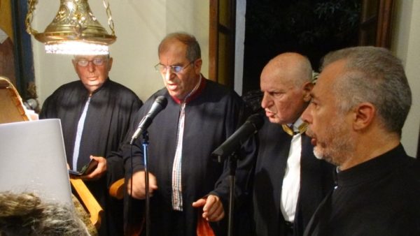 Τόσο κατά την υποδοχή, όσο και κατά τον Εσπερινό και την Θεία Λειτουργία έψαλε η χορωδία καλλίφωνων ιεροψαλτών υπό τη διεύθυνση του κ. Αναστασίου Χατζηλάρη, πλαισιουμένου υπό των κ.κ. Ευαγγέλου Χατζηλάρη, Ισιδώρου Λιβανού, Εμμ. Πλόχωρου, Ραφαήλ Χατζηλάρη και Άγγελου Αγγελίδη.