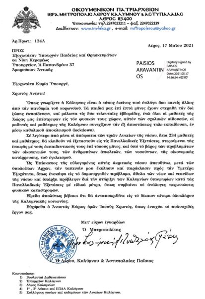 Να στηρίξει τους υποψήφιους μαθητές και μαθήτριες των Λυκείων της Καλύμνου ενόψει των επερχόμενων Πανελλαδικών εξετάσεων καλεί με επιστολή του την υπουργό Παιδείας και Θρησκευμάτων, Νίκη Κεραμέως, ο Μητροπολίτης Λέρου, Καλύμνου και Αστυπάλαιας κ. Παϊσιος.