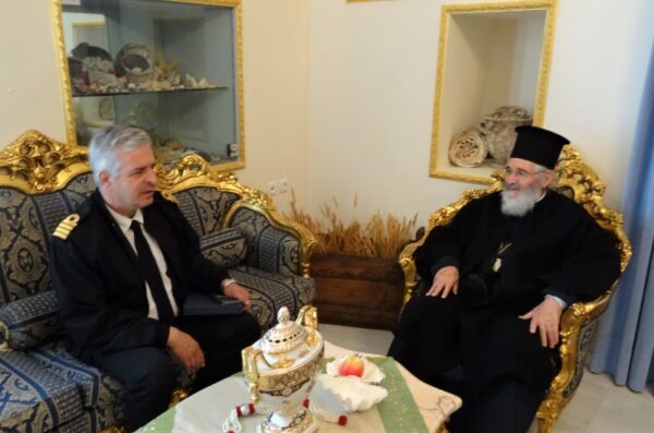 Ο Μητροπολίτης, ο οποίος συνοδευόταν από τον Αρχιερατικό Επίτροπο π. Νικόδημο Φωκά, εδέχθη με μεγάλη χαρά τον Ανώτερο Διοικητή της νήσου, στα γραφεία της Ιεράς Μητροπόλεως, στο «Πατριαρχείο», και για το γεγονός ότι κατάγεται από την Λέρο, κάτι που τιμά ιδιαίτερα το ίδιο και την γενέτειρά του.