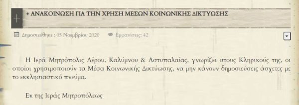 Η Ιερά Μητρόπολις Λέρου, Καλύμνου & Αστυπαλαίας, βάσει επισήμου ανακοινώσεώς της στον επίσημο διαδικτυακό ιστοτόπο της (5 Νοεμβρίου 2020), γνωρίζει στους Κληρικούς της Ιεράς Μητροπόλεως, οι οποίοι χρησιμοποιούν τα Μέσα Κοινωνικής Δικτύωσης, να μην κάνουν δημοσιεύσεις άσχετες με το εκκλησιαστικό πνεύμα.