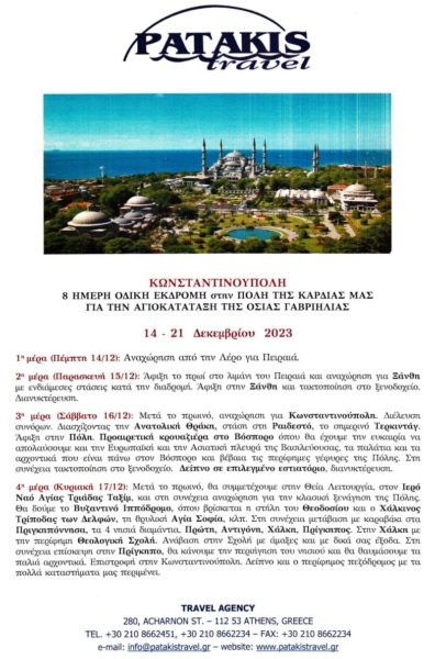 Η Ιερά Μητρόπολη Λέρου, Καλύμνου και Αστυπάλαιας διοργανώνει 8ήμερη εκδρομή στην Κωνσταντινούπολη, επ’ ευκαιρία της υπογραφής της Πατριαρχικής Πράξης Αγιοκατάταξης της Οσίας Γαβριηλίας (Παπαγιάννη), που θα λάβει χώρα την Δευτέρα 18 Δεκεμβρίου 2023, στον Πατριαρχικό Ι. Ναό του Αγίου Γεωργίου.