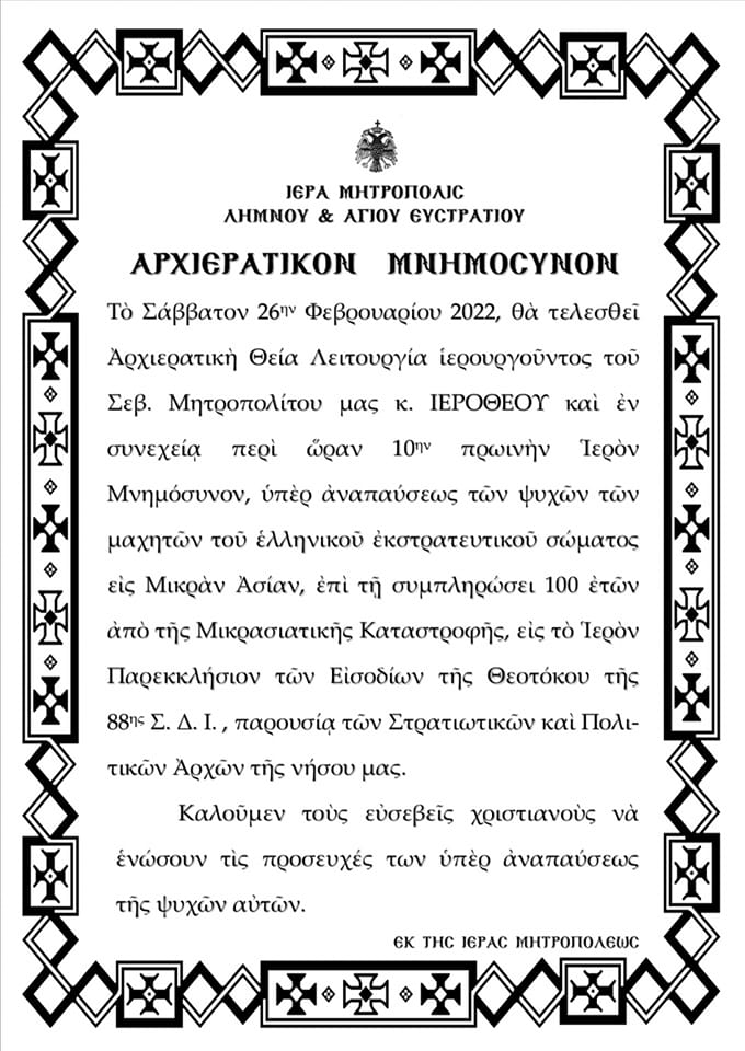 Αρχιερατική Θεία Λειτουργία θα τελεσθεί ιερουργούντος του Μητροπολίτη Λήμνου και Αγίου Ευστρατίου κ. Ιερόθεου και στη συνέχεια Ιερό μνημόσυνο υπέρ αναπαύσεως των ψυχών των μαχητών του ελληνικού εκστρατευτικού σώματος στην Μικρά Ασία για τη συμπλήρωση 100 ετών από την Μικρασιατική Καταστροφή, στο Ιερό Παρεκκλήσιο των Εισοδίων της Θεοτόκου της 88ης Σ.Δ.Ι. παρουσία των στρατιωτικών και πολιτικών αρχών της νήσου.