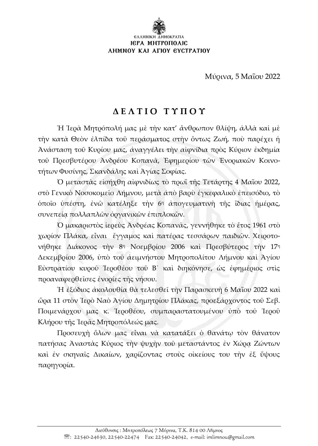 Η Ιερά Μητρόπολη Λήμνου και Αγίου Ευστρατίου αναγγέλλει την αιφνίδια προς Κύριον εκδημία του Πρεσβυτέρου Ανδρέα Κοπανά Εφημερίου των Ενοριακών Κοινοτήτων Φυσίνης, Σκανδάλης και Αγίας Σοφίας.