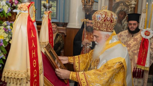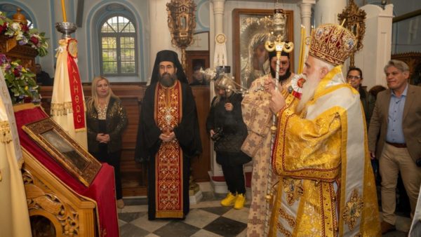 Προ του πέρατος του Αναστάσιμου Εσπερινού, ο Σεβασμιώτατος Μητροπολίτης κ. Ιερόθεος ευχαρίστησε από καρδιάς την οικογένεια, η οποία «κληρονομικῷ δικαιώματι», όπως χαρακτηριστικά επισήμανε, έχει από τους προπάτορές της το ιδιαίτερο προνόμιο και τη μεγάλη ευλογία να φυλάσσει την Αγία Εικόνα. Εξήρε δε την ολοπρόθυμη ανταπόκρισή της στο πνευματικό αίτημα της Ιεράς Μητροπόλεως να μεταφέρεται κατ’ έτος, την παραμονή της Εορτής της, στην πρωτεύουσα του νησιού, ώστε να δίδεται η δυνατότητα να προσκυνούν το ιερό αυτό σέβασμα και οι πολλοί πιστοί που αδυνατούν να ανέλθουν, λόγω του δύσβατου της περιοχής, στο όρος «Κάκαβος», κατά την κυριώνυμη ημέρα της πανηγύρεώς της, όπου μεταφέρεται.