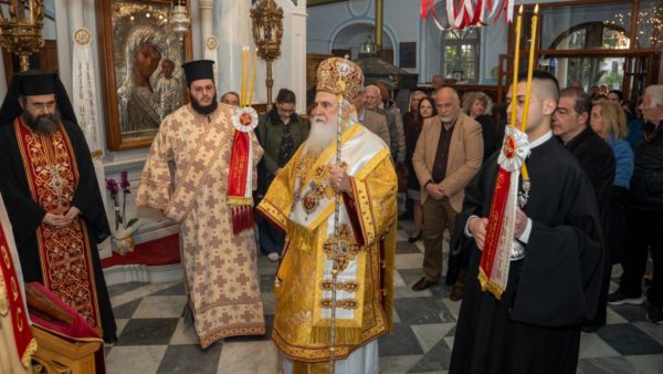 Με ξεχωριστή λαμπρότητα, αλλά και ιδιαίτερη κατάνυξη, τελέσθηκε, για πέμπτη συνεχόμενη χρονιά, η πάνδημη υποδοχή της θαυματουργού Ιεράς Εικόνος της Παναγίας της Κακαβιωτίσσης στην πόλη της Μύρινας και, ακολούθως, ο Πανηγυρικός Εσπερινός της Εορτής, μέσα στην ατμόσφαιρα της λαμπροφόρου Αναστάσεως του Κυρίου, η οποία έγινε πρόξενος «χαρᾶς ἐν ὅλῳ τῷ κόσμῳ».