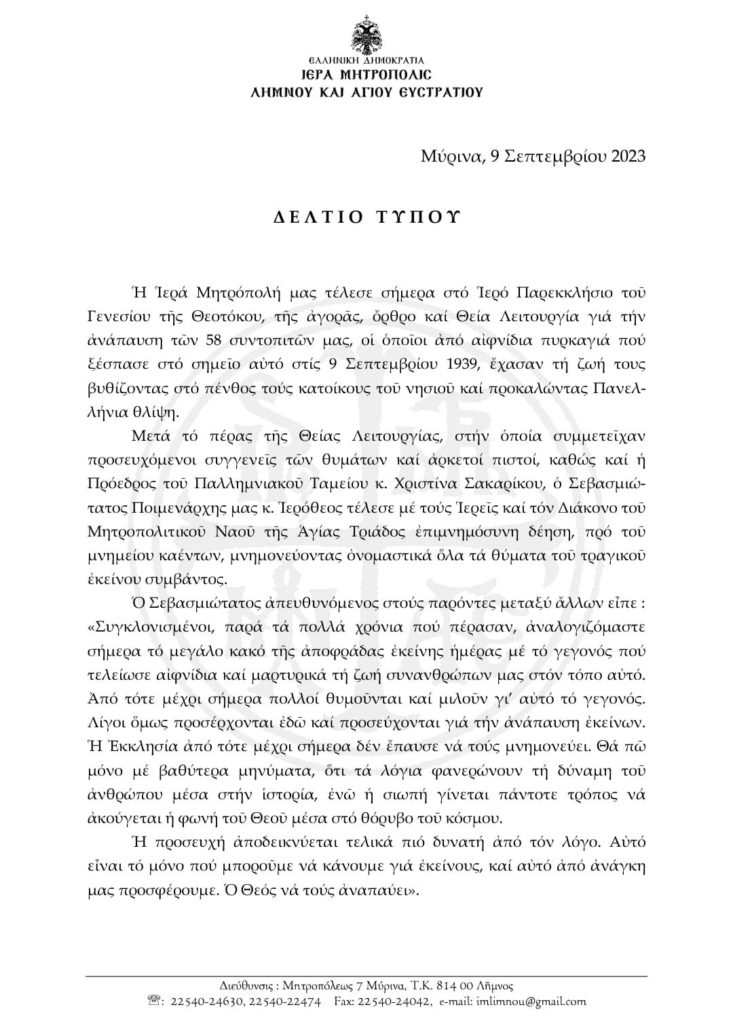 Η Ιερά Μητρόπολη Λήμνου και Αγίου Ευστρατίου τέλεσε χθες στο Ιερό Παρεκκλήσιο του Γενεσίου της Θεοτόκου, της αγοράς, όρθρο και Θεία Λειτουργία για την ανάπαυση των 58 συντοπιτών, οι οποίοι από αιφνίδια πυρκαγιά που ξέσπασε στο σημείο αυτό στις 9 Σεπτεμβρίου 1939, έχασαν τη ζωή τους βυθίζοντας στο πένθος τους κατοίκους του νησιού και προκαλώντας Πανελλήνια θλίψη.