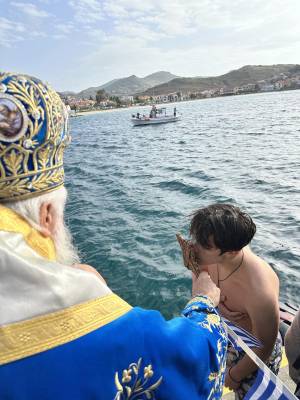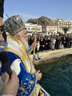 Επίσης, εξέφρασε τα θερμά συγχαρητήριά του σε όσους, με πίστη, ευλάβεια και τόλμη, βούτηξαν στη θάλασσα, προκειμένου να ανασύρουν τον Τίμιο Σταυρό, και τους επαίνεσε από καρδιάς για την προσήλωσή τους στις πατρώες παραδόσεις του τόπου μας. Ευχήθηκε, τέλος, σε όλους να έχουν τον φωτισμό του Παναγίου Πνεύματος, η δε ζωή τους να καταυγάζεται από το θερμαντικό και παρηγορητικό φως του προσώπου του Χριστού.
