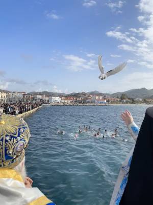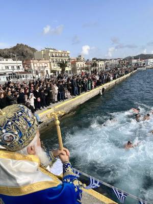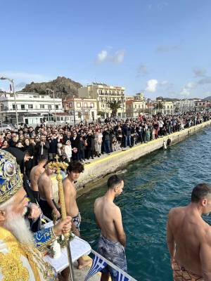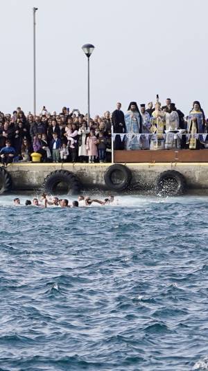 Παρά τους θυελλώδεις ανέμους, πολλοί νέοι έπεσαν και εφέτος στα παγωμένα νερά, με σκοπό να λάβουν την ευλογία του Τιμίου Σταυρού, προς φωτισμό και πνευματική ενίσχυση των ιδίων και των οικογενειών τους, τηρώντας το πολυαιώνιο έθιμο του Γένους μας και αποσπώντας το θερμό χειροκρότημα των παρευρισκομένων.