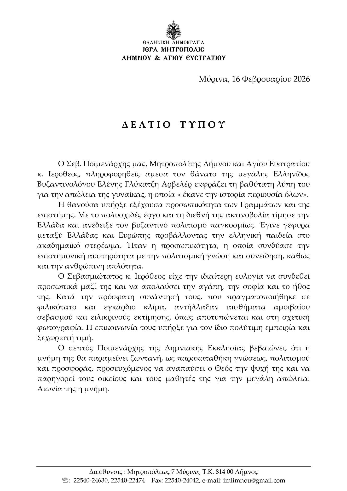 Ο Σεβ. Ποιμενάρχης, Μητροπολίτης Λήμνου και Αγίου Ευστρατίου κ. Ιερόθεος πληροφορηθείς άμεσα τον θάνατο της μεγάλης Ελληνίδος Βυζαντινολόγου Ελένης Γλύκατζη Αρβελέρ εξέφρασε τη βαθύτατη λύπη του για την απώλεια της γυναίκας, η οποία «έκανε την ιστορία περιουσία όλων».