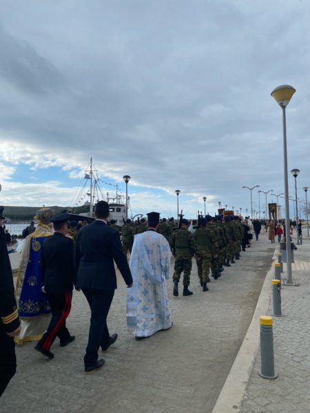 Έπειτα, πληθύς λαού, προπορευομένου στρατιωτικού αγήματος, συνόδευσε λιτανευτικά, μέσω της κεντρικής Αγοράς της πόλεως, την ιερά εικόνα της Βαπτίσεως του Κυρίου, φερομένης επί των ώμων ανδρών, ενδεδυμένων την παραδοσιακή στολή του νησιού, και κατευθύνθηκε στον παλαιό και γραφικό λιμένα της Μύρινας, όπου πραγματοποιήθηκε με κάθε επισημότητα ο καθαγιασμός των υδάτων.