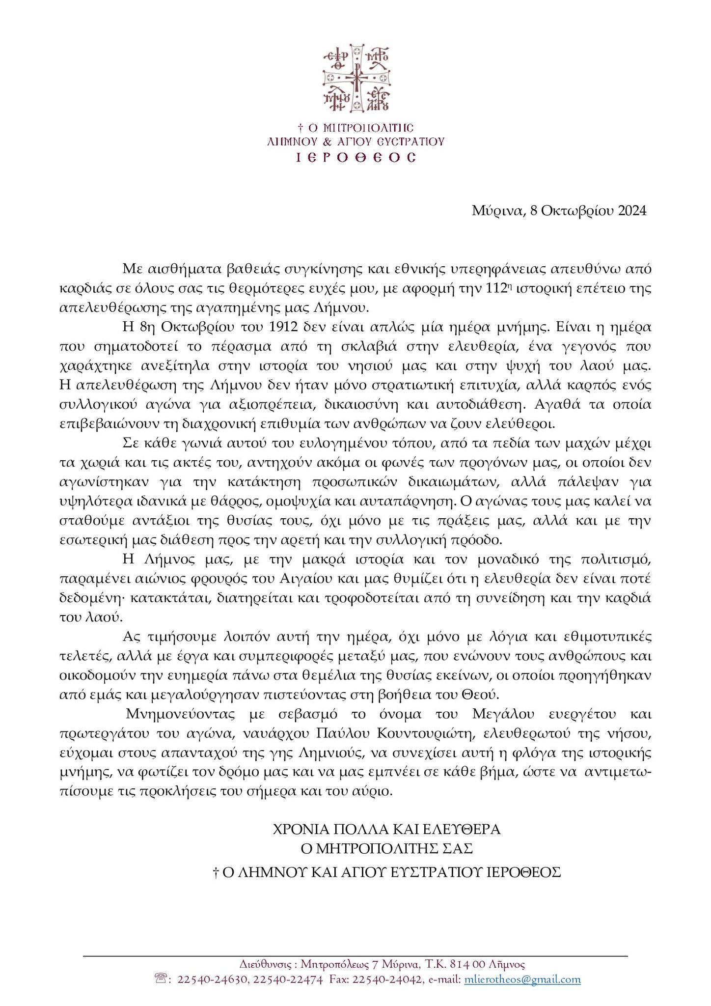 Στο μήνυμά του για την 112η επέτειο απελευθέρωσης της Λήμνου από τον τουρκικό ζυγό, που τιμάται σήμερα 8 Οκτωβρίου, ο Σεβασμιώτατος Μητροπολίτης Λήμνου και Αγίου Ευστρατίου κ. Ιερόθεος μεταξύ άλλων τόνισε: «Η 8η Οκτωβρίου του 1912 δεν είναι απλώς μία ημέρα μνήμης. Είναι η ημέρα που σηματοδοτεί το πέρασμα από τη σκλαβιά στην ελευθερία, ένα γεγονός που χαράχτηκε ανεξίτηλα στην ιστορία του νησιού μας και στην ψυχή του λαού μας».