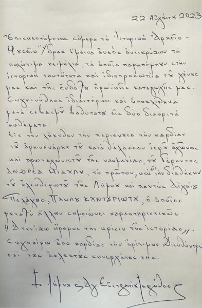 26/08/2023 27/08/2023 Ο Σεβασμιώτατος Μητροπολίτης Λήμνου και Αγίου Ευστρατίου κ. Ιερόθεος, συνοδευόμενος υπό του Πανοσιολ. Πρωτοσυγκέλλου της Ιεράς Μητροπόλεώς του Αρχιμ. π. Ιερωνύμου Σχίζα, με αφορμή την συμμετοχή του στις λατρευτικές εκδηλώσεις των Θεομητορικών εορτασμών 2023 στην αγιοτόκο και ηρωοτόκο Ύδρα, η οποία εύστοχα έχει χαρακτηριστεί, ως ναυαρχείο του αγώνος, επισκέφθηκε το Ιστορικό Αρχείο – Μουσείο Ύδρας...