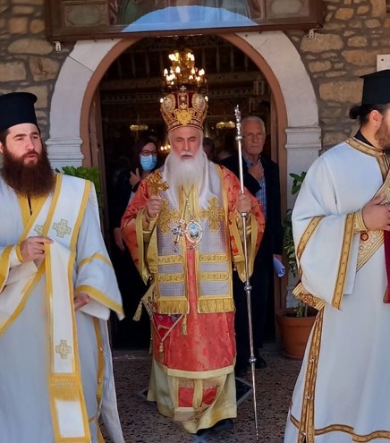Προ της απολύσεως της Θείας Λειτουργίας πραγματοποιήθηκε η λιτάνευση της εφεστείου Ιεράς Εικόνος των Αγίων πέριξ του Ιερού Ναού, διά της οποίας παρακαλούμε τον Θεό, όπως σημείωσε ο Σεβασμιώτατος, να περιτειχίζει πνευματικά και να περιφρουρεί τη ζωή των ανθρώπων του χωριού, του νησιού και της Πατρίδος μας.