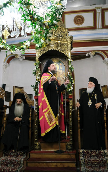 Ο Σεβασμιώτατος κ. Ιερόθεος, αφού αναφέρθηκε στα χαρίσματα των επισκεπτών Αρχιερέων, με τα οποία διακρίνονται και διακονούν την Εκκλησία, παρεκάλεσε τον χοροστατήσαντα Θεοφ. Επίσκοπο Ωρεών, να κηρύξει το θείο Λόγο.