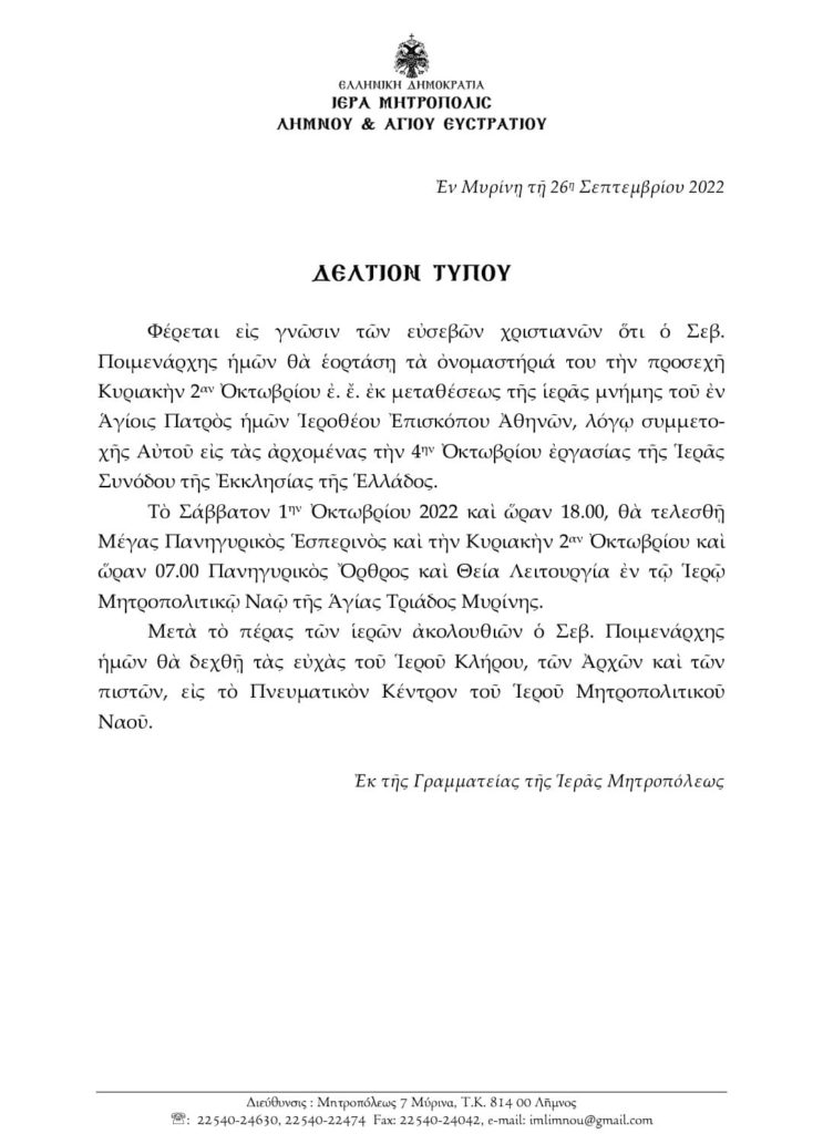 Ο Σεβασμιώτατος Μητροπολίτης Λήμνου και Αγίου Ευστρατίου κ. Ιερόθεος θα εορτάσει τα ονομαστήριά του την Κυριακή 2 Οκτωβρίου, μεταθέτοντας την ιερά μνήμη του Αγίου Ιερόθεου Επισκόπου Αθηνών, λόγω της συμμετοχής του Σεβασμιωτάτου στις εργασίες της Ιεράς Συνόδου της Εκκλησίας της Ελλάδος στις 4 Οκτωβρίου.